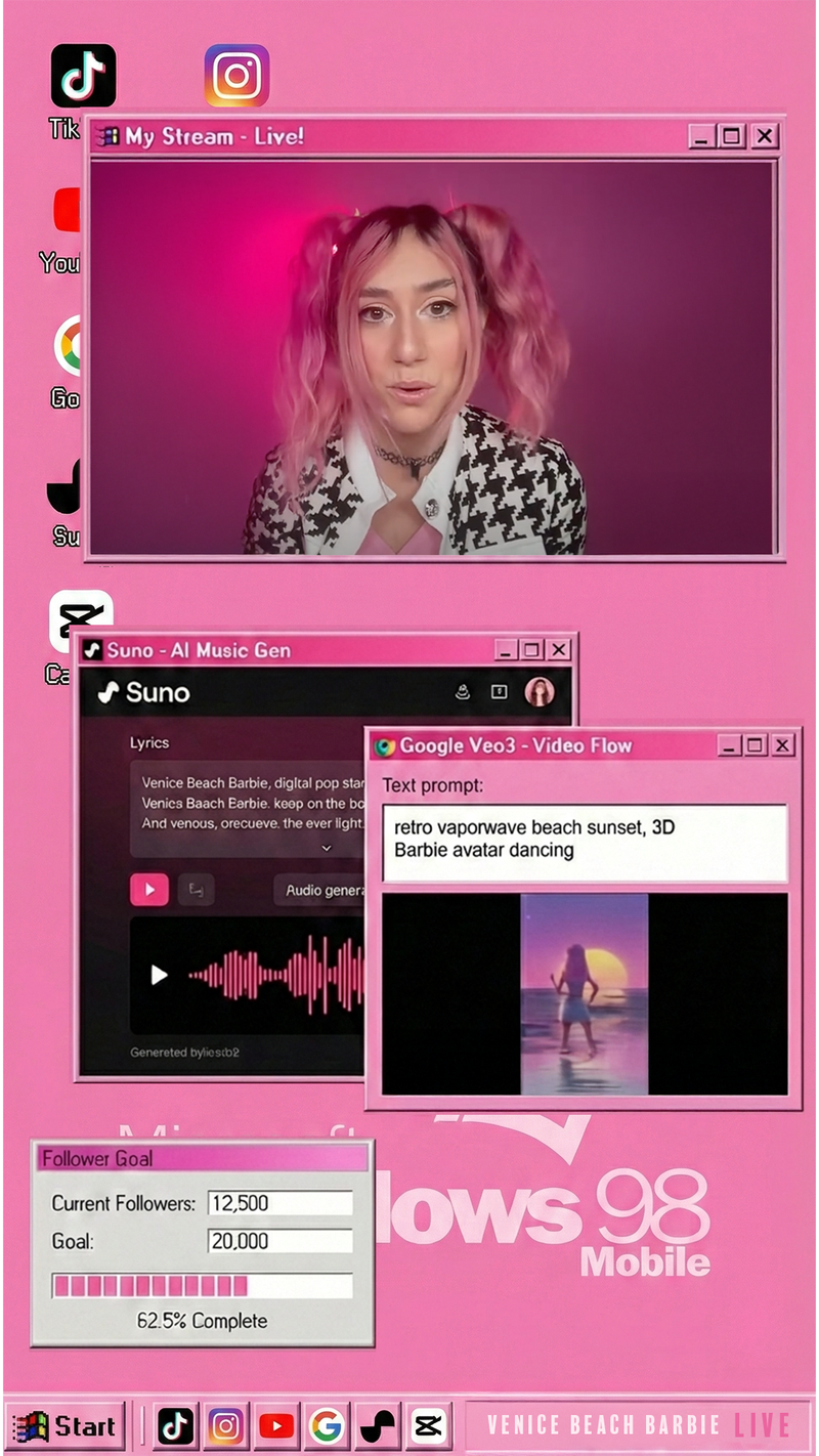 Virtual pop project @venicebeachbarbie explores identity with technology, sound, image, and online presence. Created with tools from Suno and Google, both based in Venice Beach, making the local creative-techn ecosystem interestingly authentic.